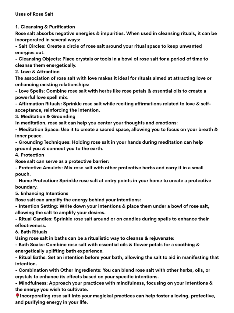 Rose Salt is created by Granny from fragrant rose petals, Pink Himalayan Salt, and a dash of natural rose essential oil. Rose Salt may be used in a variety of ways, such as added to love jars or spell bags, or sprinkled or set out in bowls in your home to create a loving and harmonious energy. 4 ounce packages