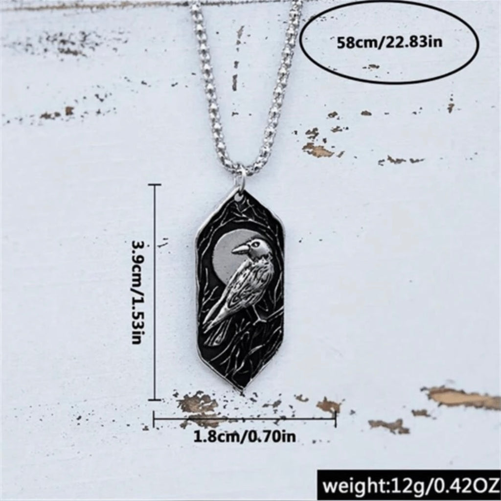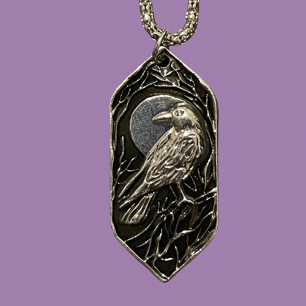 Detailed textured Raven Pendant hangs from a 24” chain.