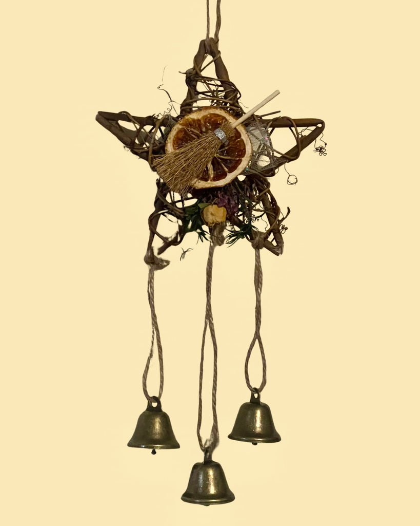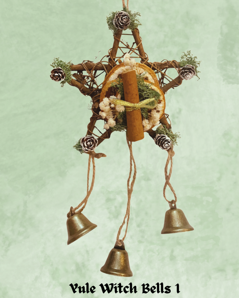 Yule Witch Bells are approximately 12.5” from their grapevine star top to their longest bell, with an additional 7.5” from top of jute hanger. Each set of bells comes with a chant card & mini bottle of Yule Oil to bless it with. Bells may vary slightly, as they’re handcrafted personally by Granny Maggie.